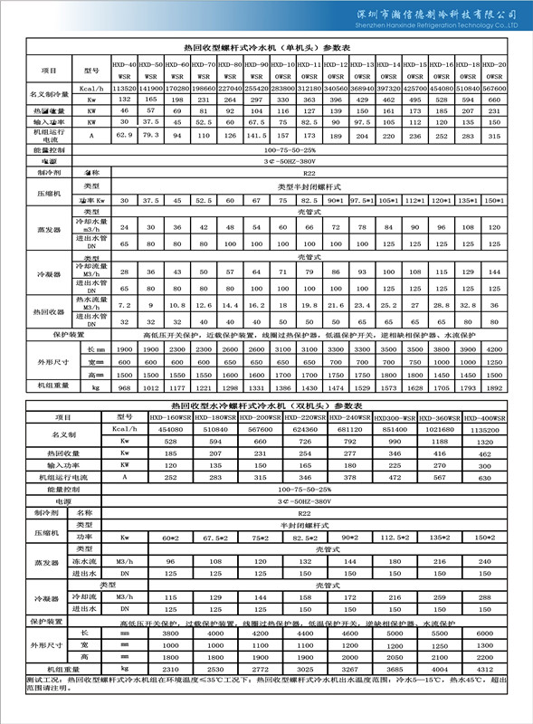 熱回收冷水機(jī)組分為:水冷螺桿式和風(fēng)冷螺桿式熱回收冷水機(jī)組兩種,又名熱回收型螺桿式制冷機(jī),水冷式需要配合冷卻塔使用,制冷效率高于風(fēng)冷式,但風(fēng)冷式有安裝方便的優(yōu)點(diǎn),因此它們各有所長(zhǎng),廣大用戶朋友可根據(jù)自己的實(shí)際情況選用適合自己的熱回收冷水機(jī)組。如果您不知道應(yīng)該怎么選用,可致電我們技術(shù)工程師咨詢!